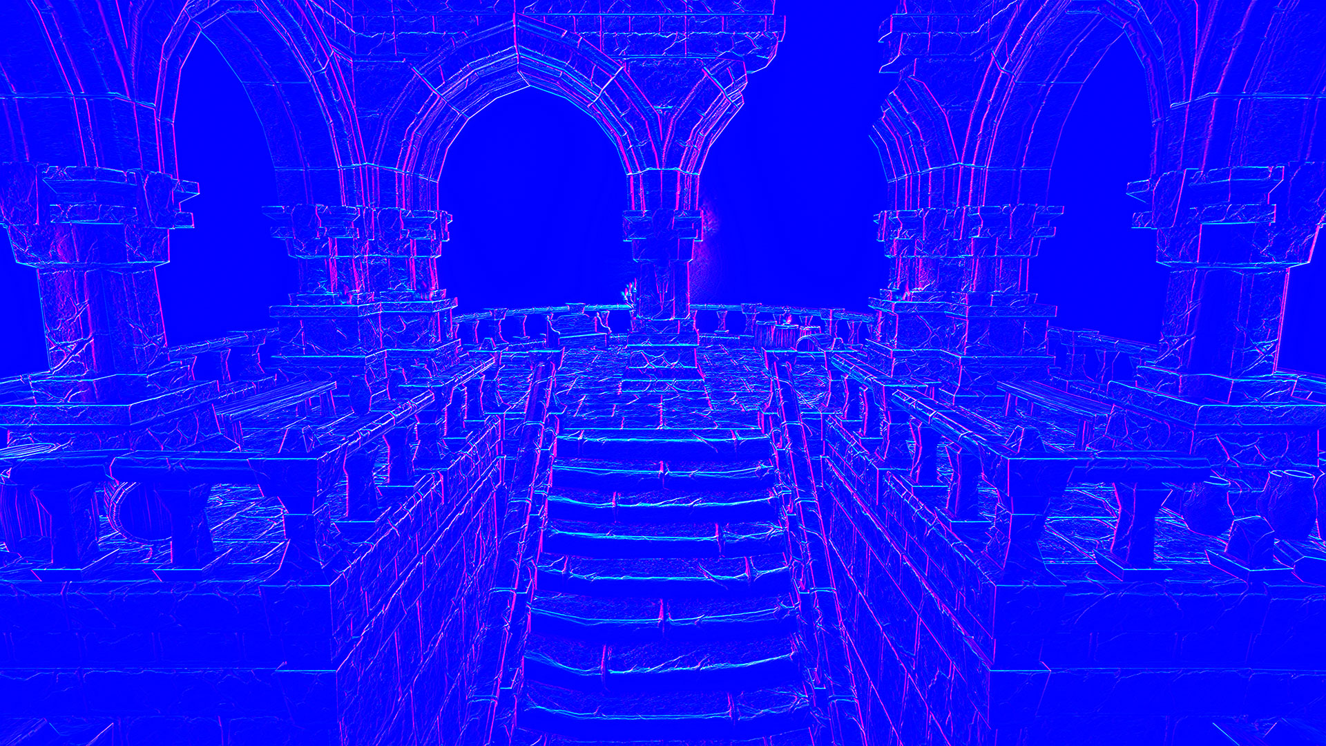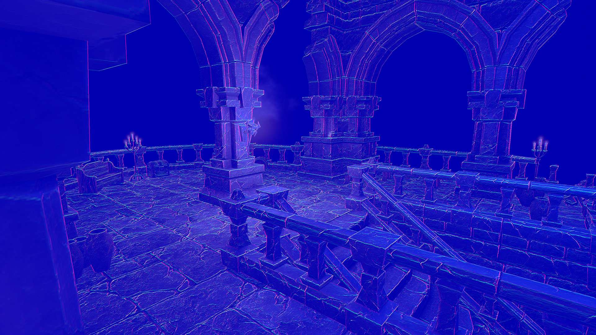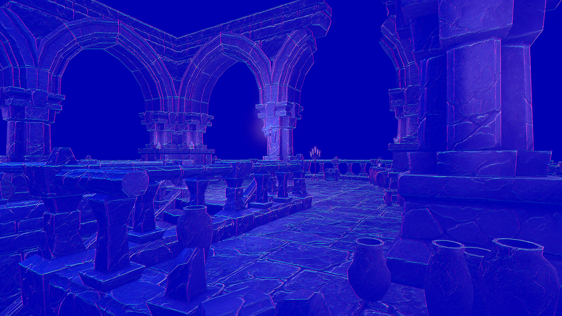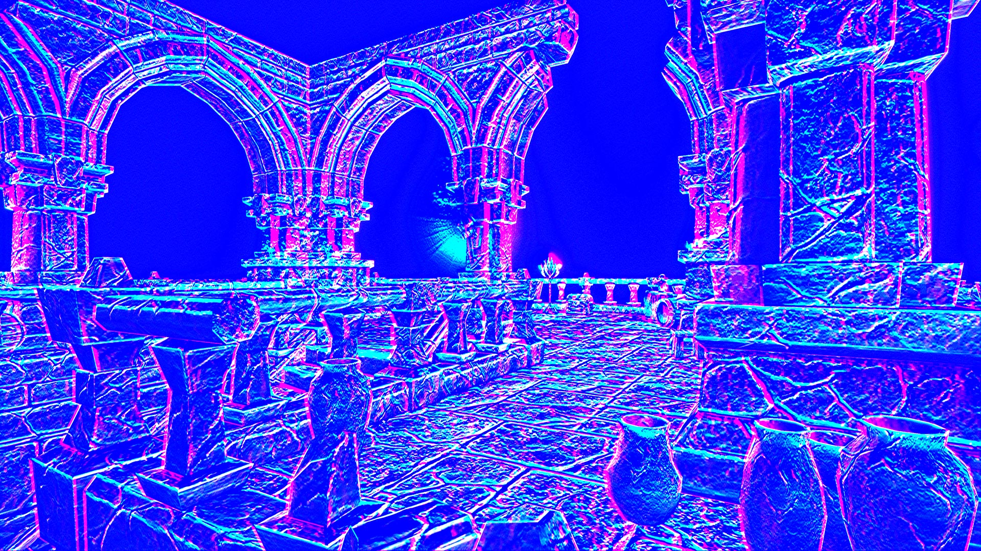 This normal world post process shader has been created in Unreal Engine. The shader is interactive through exposed material parameters, which allow the developer to modify various properties.