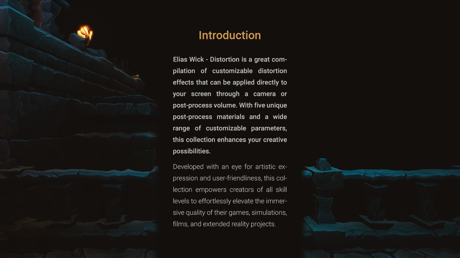 Elias Wick - Distortion is a great compilation of customizable distortion effects that can be applied directly to your screen through a camera or post-process volume. With five unique post-process materials and a wide range of customizable parameters, this collection enhances your creative possibilities.