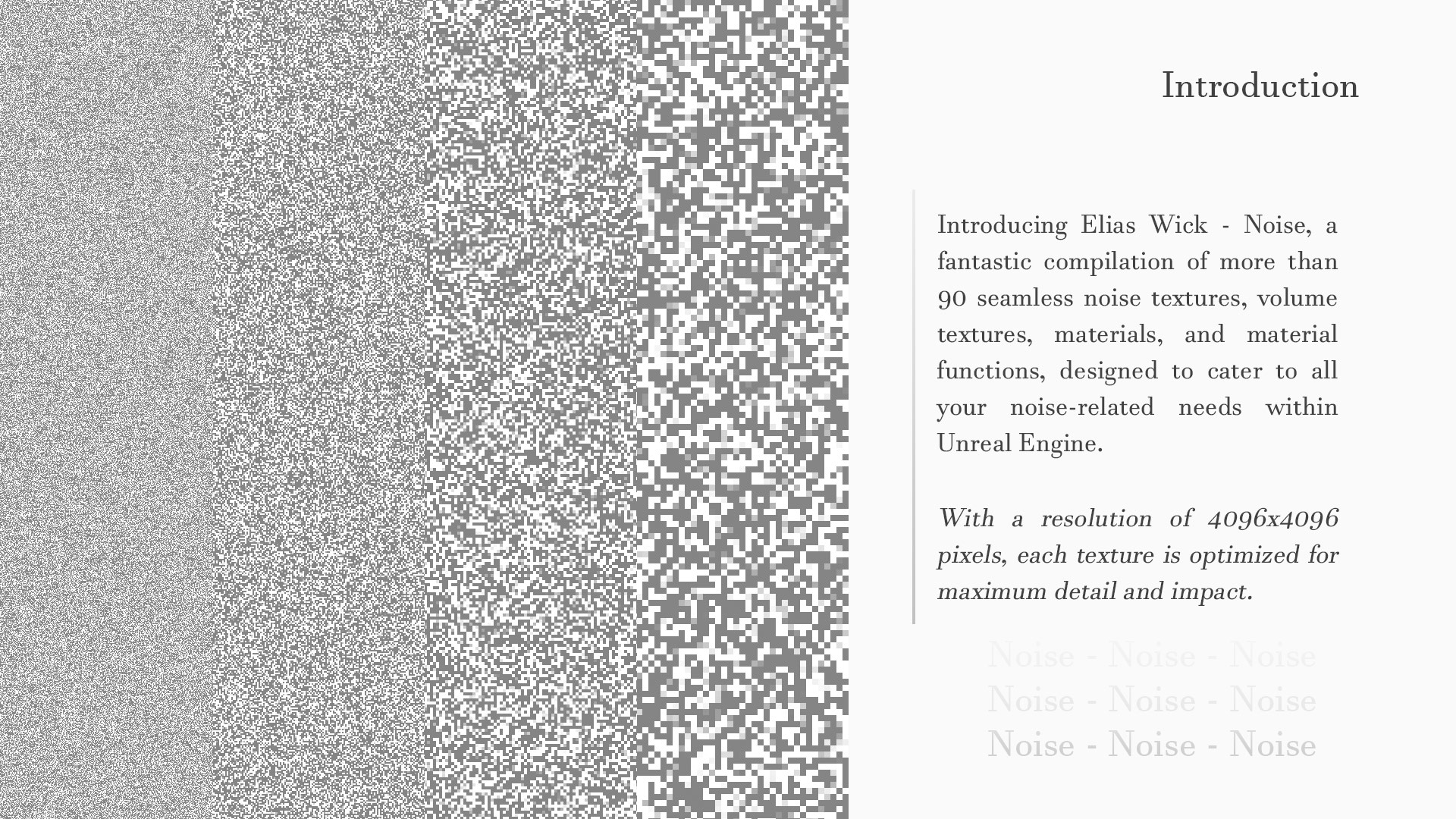 Introducing Elias Wick - Noise, a fantastic compilation of more than 90 seamless noise textures, volume textures, materials, and material functions, designed to cater to all your noise-related needs within Unreal Engine.