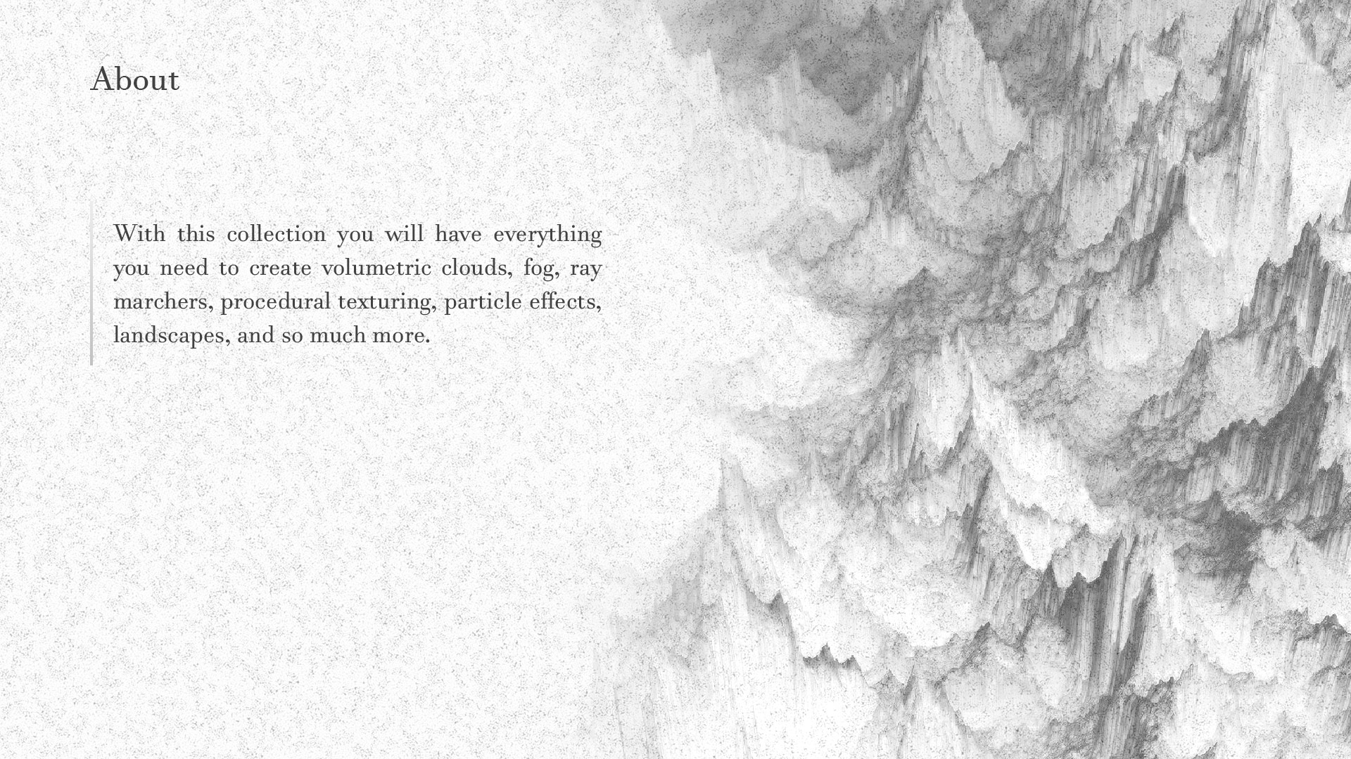 With this collection you will have everything you need to create volumetric clouds, fog, ray marchers, procedural texturing, particle effects, landscapes, and so much more. I strongly recommend watching the showcase video to truly grasp how incredibly powerful and versatile this collection of textures and materials are.