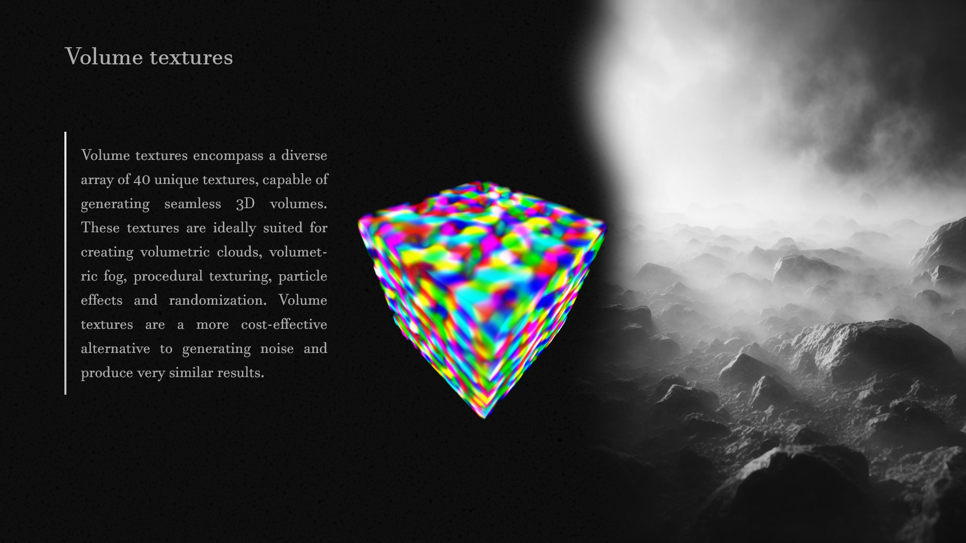 Volume textures encompass a diverse array of 40 unique textures, capable of generating seamless 3D volumes. These textures are ideally suited for creating volumetric clouds, volumetric fog, procedural texturing, particle effects and randomization. Volume textures are a more cost-effective alternative to generating noise and produce very similar results.